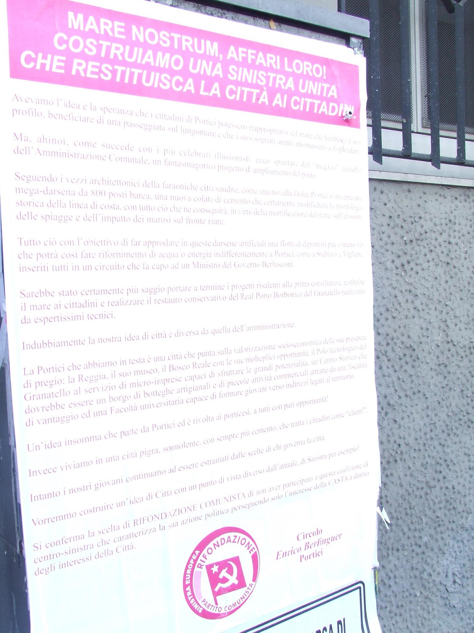 “Avevamo l’idea e la speranza che i cittadini di Portici potessero riappropriarsi del mare che lambisce il suo profilo, beneficiare di una passeggiata sul lungomare e che i suoi sognati arenili ritornassero a splendere. Ma, come succede con i più celebrati illusionisti, ecco spuntare dal “magico” cilindro dell’amministrazione comunale, un fantasmagorico progetto di ampliamento del porto”. Il progetto di restyling del water front porticese è il bersaglio di una critica feroce degli esponenti di Rifondazione comunista che hanno “gridato” il loro dissenso attraverso manifesti affissi sui muri della città. “Seguendo i vezzi architettonici delle faraoniche città saudite – si legge sul manifesto -, come una novella Doha, Portici si inventa una mega darsena da 800 posti barca, una nuova colata di cemento che certamente modificherà la morfologia storica della linea di costa, con tutto ciò che ne conseguirà, in virtù della mortificazione del mare, sull’erosione delle spiagge e dell’impatto dei marosi sul fronte mare”. “Tutto ciò – afferma Silvio Vanacore, segretario di Rifondazione comunista a Portici – con l’obiettivo di far approdare in queste darsene artificiali una flotta di diportisti più o meno vip che potrà,così, fare rifornimento di acqua o energia indifferentemente a Portici, come a Stabia o a Vigliena, inseriti tutti in un circuito che fa capo ad un Ministro del Governo Berlusconi. Sarebbe stato certamente più saggio – conclude Vanacore – portare a termine i progetti risalenti alla prima consiliatura, restituire il mare ai cittadini e realizzare il restauro conservativo del Real Porto Borbonico del Granatello realizzato da espertissimi tecnici”. Rifondazione, distaccatasi ormai da tempo dall’amministrazione di centrosinistra del sindaco Vincenzo Cuomo fornisce la propria ricetta per il rilancio della città: “Indubbiamente – affermano pubblicamente gli esponenti di Rc – la nostra idea di città è diversa da quella dell’amministrazione. La Portici che abbiamo in testa è una città che punta sulla valorizzazione socio-economica delle sue presenze di pregio: la Reggia, il suo museo, il Bosco Reale con le sue molteplici opportunità, il Polo tecnologico del Granatello al servizio di micro-imprese capaci di sfruttare le grandi potenzialità, un Centro storico che dovrebbe essere un borgo di botteghe artigianali e di piccole attività commerciali attratte da una fiscalità di vantaggio ed una Facoltà universitaria capace di formare giovani verso indirizzi legati al territorio. Invece – conclude il manifesto – viviamo in una città pigra, sonnolenta, con sempre più cemento e che tratta i cittadini come “clienti”, mentre i nostri giovani continuano ad essere estraniati dalle scelte di chi governa”. Con questo atto Rc conferma, in definitiva, la sua scelta a non aver partecipato all’attuale coalizione di centrosinistra che “caratterizza la sua azione politica – chiosa Silvio Vanacore – perseguendo solo l’interesse della Casta a danno degli interessi della città”.