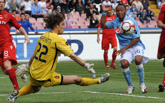 Non si fa nemmeno in tempo a parlare di maledizione e si blocca Lavezzi. Prova e riprova ma il muscolo della coscia gli dà fastidio. Col Pocho in campo il Napoli sfiora il gol tre volte. Prima con Denis al 7′ di testa: Marchetti manda in angolo. All’11’ destro di Hamsik: Marchetti alza sulla traversa. Al 15′ destro di Denis, Marchetti blocca. E per quante volte verrà pronunciato durante la partita il nome del portiere sardo, si capisce bene chi è stato il protagonista. Esce Lavezzi, entra Bogliacino. Il Napoli mette a ferro e fuoco l’area cagliaritana. Al 36′ Denis lanciato da Pazienza va via bene in area e chiude di destro, para Marchetti. Il portiere fa il bis ancora su Denis di testa, respingendo una palla quasi sulla linea. Sfortunato il Tanque, prodigioso Marchetti. Al 38′ sinistro in area di Gargano e, manco a dirlo, il portiere respinge. Al 43′ ultimo guizzo di Hamsik, cross per Denis, Marchetti anticipa tutti. Finisce il primo tempo: 0-0. Nel secondo tempo si gioca ad una porta. Il Napoli le prova tutte. All’11’ sinistro di Bogliacino, debole. Al 18′ grande azione in combinata Hamsik-Denis, cross dello slovacco ed il Tanque per un soffio non chiude in spaccata. Al 20′ mischia furiosa e Marchetti esce alla disperata su Bogliacino in area rischiando anche il rigore. Al 38′ l’ultima palla clamorosa: Zuniga entra in area in progressione ma davanti a Marchetti chiude fuori il diagonale.
