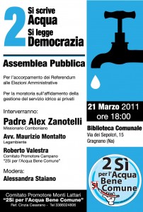 Lunedì 21 marzo ore 18, presso la Biblioteca Comunale di Gragnano (via Sepolcri, 15) si terrà l’assemblea pubblica “Si scrive Acqua, si legge Democrazia”. interverranno: padre Alex Zanotelli, missionario comboniano; l’avv. Maurizio Montalto, autore del libro “L’acqua è di tutti” ediz. L’ancora; Roberto Valestra, comitato promotore campano 2Sì per l’Acqua Bene Comune; modera la giornalista Alessandra Staiano.