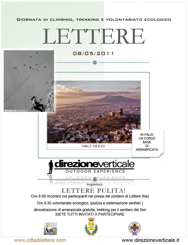 Domenica 8 maggio 2011, dalle ore 8:00 alle ore 11:00, nei pressi del Castello di Lettere (NA), si svolgerà l’evento “Lettere Pulita”, organizzato da Direzione Verticale, Associazione sportiva, culturale e naturalistica, affiliata Fasi (Federclimb) e Uisp Lega Montagna.