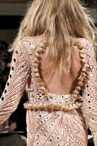 Ed è proprio la lavorazione quella che merita una lente d’ingrandimento . Come quella dello splendido dress lavorato color carne. Base fatta di tulle ( color carne ) – doppiato di chiffon all’interno – su cui è stata applicata , di taglio , una fettuccia di plissé di seta : permettendo di ricreare il disegno del pizzo guipere , dando tridimensionalità al decoro , tutto giocato sui toni nude . Una lunga