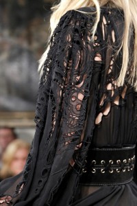 dello stilista – ecco sahariane di suède , gonne vaporose nei toni del blu e del bianco , minivestiti e lunghe casacche in pizzo noir dal mood rock .