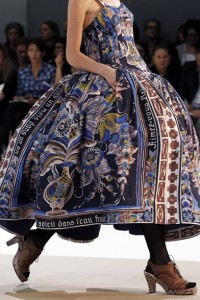 pieghettature e accompagnati da corpetti-bolero di tessuto o pelle stampata . Piccoli pezzi patchwork che vestono con brio sia per l’intrepido mix di stampe , sia per la buona costruzione delle linee dall’aria work in progress – vedi orli scuciti e impunture a vista – ma in realtà ben strutturate e precise .