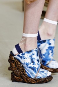 Meritano particolare attenzione i sandali con zeppe di legno istoriate con tomaia in pelle a stampa a vaso cinese .