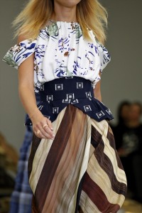 mescolandosi al tulle ricamato con foglie applicate , al broccato , al cotone , al lino. Forte la presenza di stampe e lavorazioni jacquard per i tessuti che riproducono motivi diversi – particolari quelli delle striature dei legni – per abiti e pantaloni prettamente a vita alta , sottolineati da