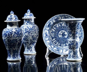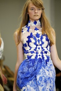I colori delle porcellane cinesi compaiono come flash su abiti e completi di seta e chiffon stampato