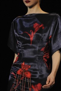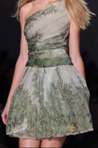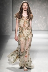 Floreal bohemien botanica per Alberta Ferretti che veste una donna di fiori e tagli al vivo trasversali su uno chiffon color panna interpretando , così , uno “spirito libero e ultra femminile” . Dagli archivi di Versus ecco un miniabito pop romantico geometrico di cotone fatto di collages di fiori minuti e colori a contrasto . Florilegio di peonie di satin e taffetas di seta di Bucol firmato Rochas per