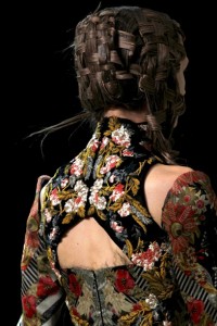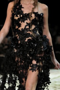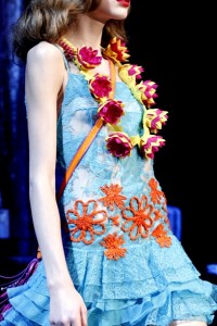 Moder Art & Crafts per l’abito materico di farfalle/fiori fatte di piume dipinte a mano . Ribbon work . Stile pagano che inneggia al “Power of nature and free spirit “ quello fatto sfilare in passerella da Alexander McQueen .