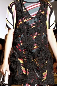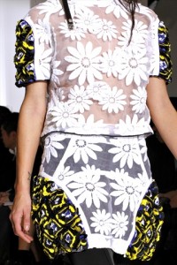 mixaggio tra tonalità techno e applicazioni , come nel caso di Marni, dove macro margherite si stagliano sulla rete ricamata .