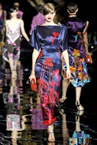 Profumo d’oriente per l’abito chimono florilegio di ibiscus di Luis Vuitton. Mood tra orientale e “camp” con l’aggiunta di lunghe frange di seta e labbra scarlatte.