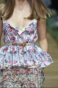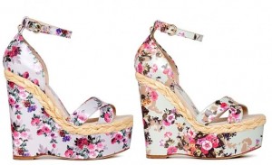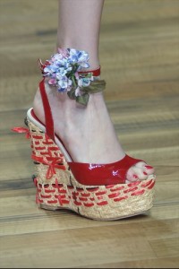 botanico – vedi guanti da giardinaggio accessoriati – , sottili cinure in corda e pelle , stivali di gomma colorati con zeppa , foulard a fiori e quadri legati in testa . Ai piedi wedges con stampa Vichy e tomaia guarnita da fiocchi e sandali con zeppa intrecciata e stoffa con motivo intonato alla stampa dell’abito; zeppe espadrille dal sapore vintage rese originali dai mazzetti di fiori che cingono i cinturine alla caviglia regalando quel tocco in più di spensieratezza e romanticismo .
