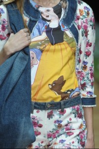dando vita ad una maglina stampata a quadri e a fiori. Pizzo di vari colori pastello per una nota romantica . Tocco urban quello delle t-shirt stampate con i personaggi delle fiabe – Biancaneve -.