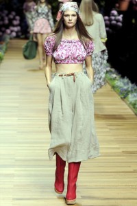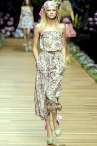 Come ci mostra la collezione D&G dall’ispirazione ( very very ) Farmville . Un’allegra fattoria quella portata in passerella dal duo siciliano, abitata da giovani donne che amano vivere all’aria aperta indossando abiti ispirati al gardenwear : piccole e grandi corolle dalle molte varietà botaniche immergono e avvolgono le stoffe dei bloomers ( culotte ) , shorts , overall , gonne a balze , prendisole , grembiuli , minigonne . Ovunque domina questa profusione di fiori stampati su tessuti leggeri o più corposi, spezzati da altri capi di tela, denim e a stampa Vichy. Una tavolozza infinita che si declina in varie tonalità e