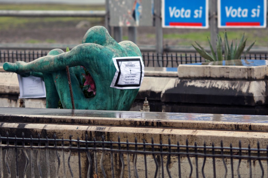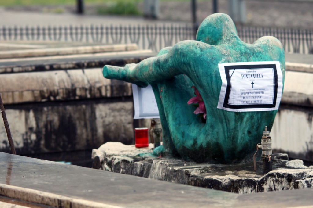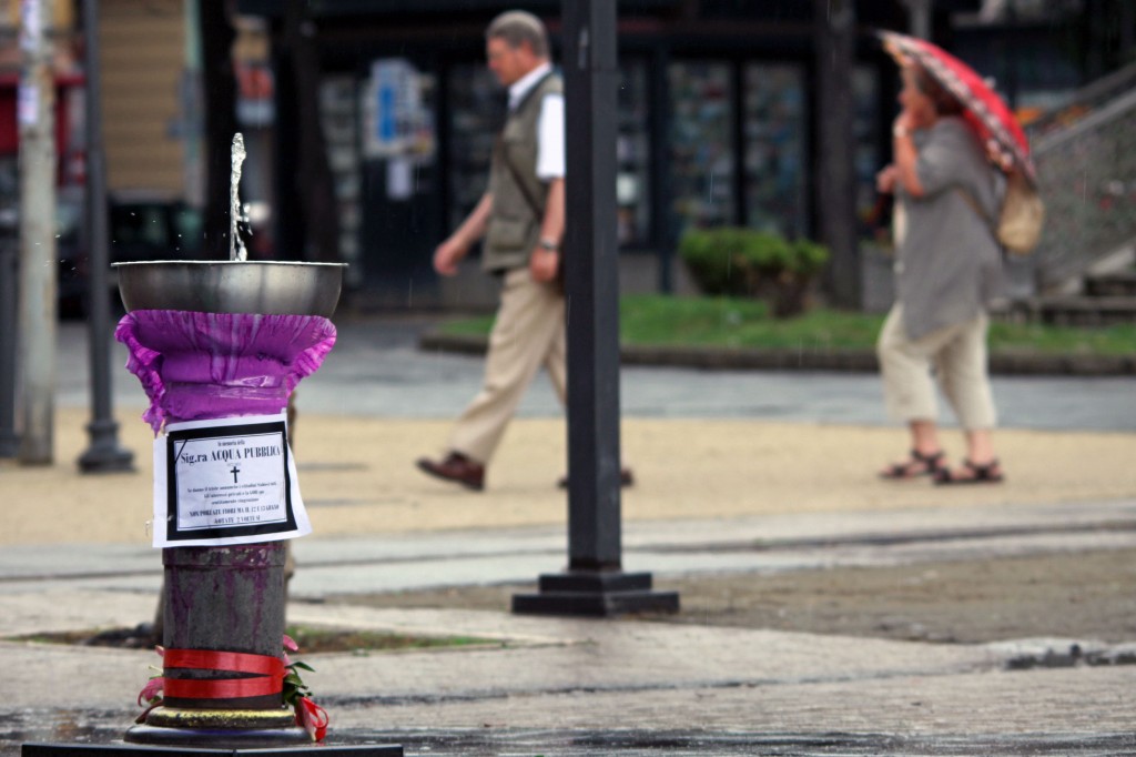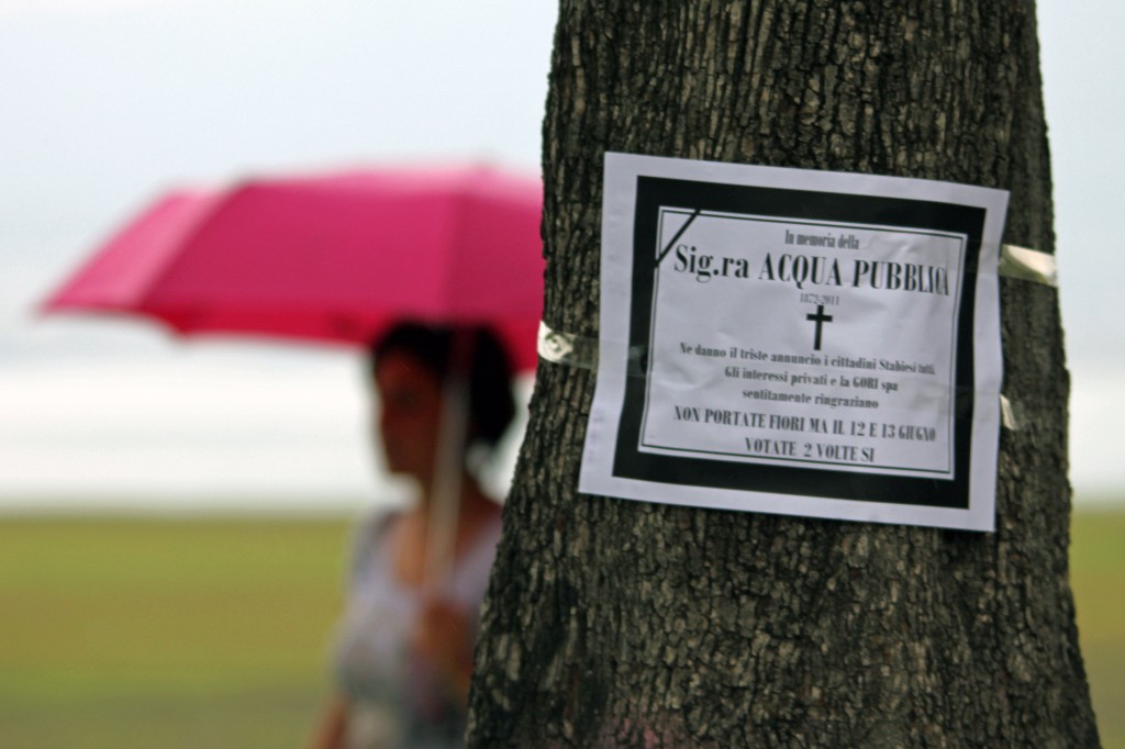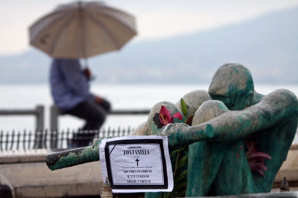 L’ultima battaglia per dire “SI” all’acqua pubblica parte propria dalla cittadina di Castellammare di Stabia, in provincia di Napoli, soprannominata “la Città delle Acque” in considerazione del fatto che quì ci sono le Terme di Stabia con le sue 28 sorgenti termali benefiche che la rendono famosa in tutto il mondo. Da questa mattina, su tutte le fontanine, gli alberi e alcuni monumenti della villa comunale, sono comparsi dei manifesti funebri, lumini funebri e fiori (tipicamente cimiteriali) che invitano a votare due SI ai Referendum del 12 e 13 giugno. Anche il “Monumento del Canottiere”, dedicato alle imprese dei mitici canottieri azzurri “I Fratelli Abbagnale”, Giuseppe e Carmine, non è stato risparmiato. Infatti, il canottiere è stato listato a lutto sia sul petto che sul dorso e adornato, anch’esso, con lumini e fiori cimiteriali.