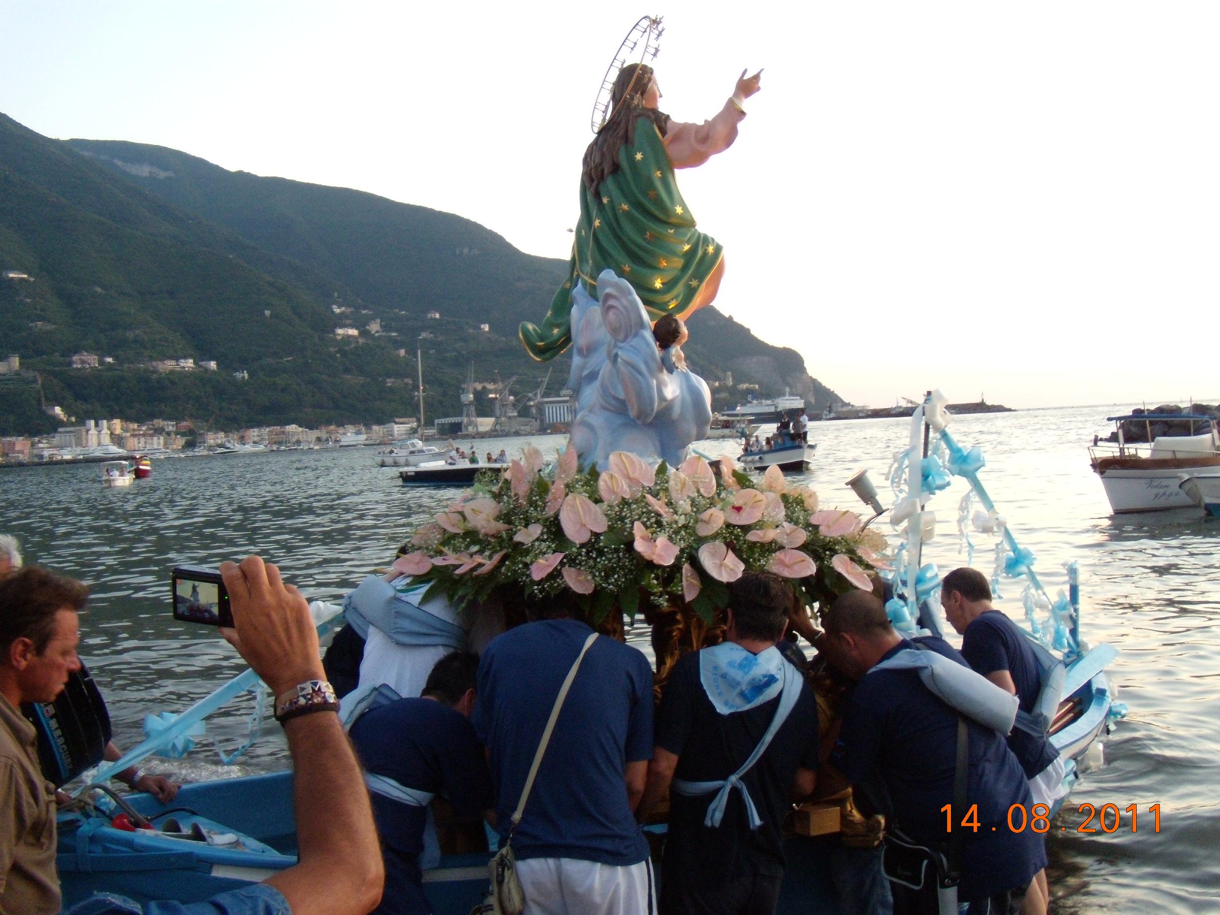 Da un lato i monti Lattari avvolti dalle tenebre notturne, ma incoronati da una luna piena argentea e diafana. Dall’altro il mare ed il golfo di Napoli punteggiato da centinaia di luci scintillanti che arrivavano fino al piccolo tratto dell’arenile stabiese nei pressi della villa comunale dove diverse migliaia di persone attendevano trepidanti l’arrivo della Madonna dell’Assunta. Una notte d’estate da sogno per Castellammare di Stabia. Il 14 agosto la città era già in festa dalle sei del pomeriggio e le bancarelle in villa comunale risuonavano dell’allegro ciarlio degli adulti e dei trilli eccitati dei bambini. La processione ha avuto inizio solo un’ora più tardi e la statua della Madonna ha percorso il breve itinerario fino alla spiaggia nei pressi dell’hotel Virginia. Il comitato “San Francesco Saverio” quest’anno ha superato se stesso disponendo un percorso suggestivo, sapendolo anche evidenziare con giochi pirotecnici, che annunciavano alle persone distanti l’arrivo della processione. Durante l’imbarco è stato particolarmente toccante il momento in cui il parroco don Michele Di Martino ha invitato i fedeli a pregare per i morti provocati dalla recente tragedia che ha visto l’affondamento di un peschereccio. Terminato il momento di preghiera la festa è continuata e la Madonna ha proseguito il suo percorso verso Marina di Stabia sulla nave guidata dal pescatore Raffaele Criscuolo. Quest’anno c’è stata una nuova e gradita aggiunta al momento della partenza, ossia il lancio di fiori che ha fatto da perfetta cornice al tramonto su cui una nutrita flotta di piccole navi ha accompagnato la statua nel suo viaggio. La statua è approdata alla fine su un arenile inaspettatamente pulitissimo, grazie all’opera di volontari, con la folla entusiasta che fra fuochi d’artificio e canti religiosi ha accompagnato la Madonna in Cattedrale, dove il vescovo Felice Cece ha celebrato l’eucaristia.