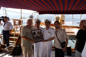 Nella mattinata del 14 settembre 2011, una rappresentanza di liberoricercatore.it, nelle persone di Maurizio Cuomo e del dott. Giuseppe Plaitano, accompagnata virtualmente da tutti i collaboratori che nel decennio hanno collaborato al progetto, giunge in punta di piedi a bordo del Vespucci, ed attende affascinata che il programma ufficiale della consegna di decine di targhe e targhette, si concluda. Il momento è solenne e sono presenti le massime cariche militari e civili, la cerimonia ufficiale, dopo innumerevoli omaggi, conferimenti e premiazioni, volge al termine ed il Comandante della nave, il Capitano di Vascello Paolo Giacomo Reale, prende la parola per un breve discorso, si congeda poi dal pubblico, per raggiungere il Comandante Giuseppe Menna della Capitaneria di Porto di Castellammare di Stabia, che nell’occasione presenta liberoricercatore. L’incontro è emozionante e il Comandante del Vespucci, accoglie compiaciuto l’omaggio fotografico offertogli, poi nel ringraziare soddisfatto, esterna: “Questa la mettiamo subito affissa nel nostro Quadrato Ufficiali!”. Giusto il tempo di fare una foto ricordo e l’impegnatissimo Comandante viene nuovamente “rapito”, questa volta per concedersi ad una intervista della RAI. Del fugace importantissimo incontro, che di certo segna una tappa importante del cammino di liberoricercatore.it, rimane: la professionalità e l’eccezionale organizzazione del Comandante della Capitaneria di Porto di Castellammare di Stabia, il Capitano di Vascello Giuseppe Menna, del suo vice Amitrano e dei sottoufficiali (Sabatino & De Nicola) che si sono prodigati per permettere l’incontro, la cordialità del Comandante Reale e dell’ufficiale Busonero, facente funzioni di addetto stampa della Marina, che con assoluta sorpresa degli operatori del portale web stabiese, si è complimentato confidando di conoscere già da tempo il loro prezioso operato e di aver consultato i contenuti del portale, svariate volte. Una emozione indescrivibile, quella provata, che per gli anni a venire, di certo darà a liberoricercatore.it la soddisfazione di poter dire che un suo affettuoso pensiero, seppur semplice, navigherà affisso nel “Quadrato Ufficiali” della nave più bella del mondo, la nave scuola Amerigo Vespucci!!!