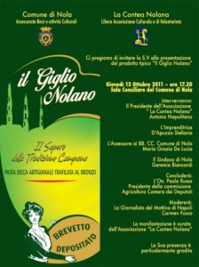 Ecco perché é nata la pasta “Il Giglio Nolano” parole, di D’Apuzzo Stefania e Massimo Parisi giovani imprenditori che con coraggio ed abnegazione hanno investito i propri risparmi per creare un prodotto tipico dell’area nolana. L’Associazione Culturale e di Volontariato “La Contea Nolana” entusiasta dell’iniziativa, il giorno 13 Ottobre 2011 alle ore 17,30 presso la Sala consiliare del Comune di Nola alla presenza di autorità civili e religiose, si pregia di presentare alla Città di Nola l’autore ed il prodotto della splendida iniziativa.