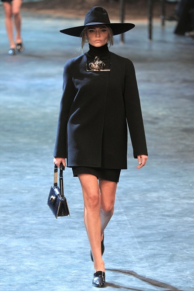 Dark lady bon ton da Lanvin : silhouette essenziale , grafica , ridotta nelle rigide forme di un cappotto a sacco , corto , chiuso da zip con scollo sagomato. Appuntato sul collo ( alto ) della tunichetta sottostante un maxi bijoux in metallo dorato sembra un amuleto stregato e in testa un cappell(acci)o da vera streghetta .