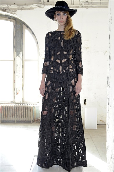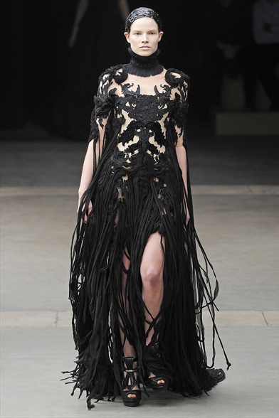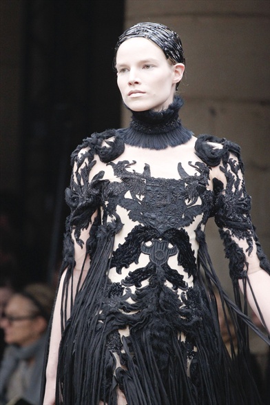 Dai primi fiumi di nebbia esce la donna della notte di Samhain firmata Sarah Burton per Alexander McQueen aprendo le ( macabre ) danze all’interno della Conciergerie , la prigione dove Maria Antonietta trascorse i suoi ultimi giorni in attesa del patibolo . Il luogo sinistro e stregato (ben) accoglie questa drammatica e romantica creatura celtica , che si svela attraverso un ampio abito nude look “ultra coprente” fatto di intarsi , tulle di seta lavorato a telaio , velluto jacquard di lana