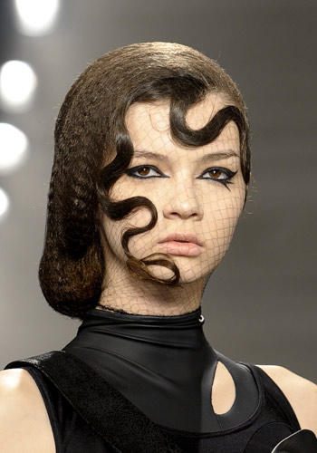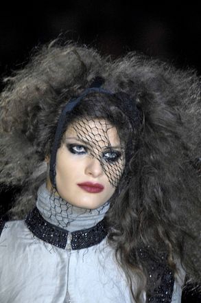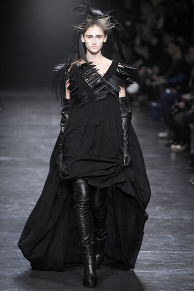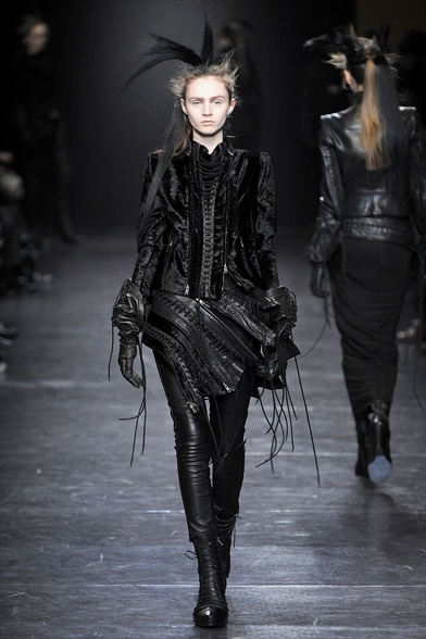 Dark side puro , ai limiti del grottesco quello che emana la streghetta firmata Ann Demeulemeester : tessuti neri laceri fatti di pelle , jersey e lana , combinati in corpetti e indossati a rovescio con applicazioni di lacci , zip , bottoni allineati di sbieco . Allure ultra noir estremizzata dall’aggiunta di lunghi cappotti in pelo di capra , cinture decorate da piume e portaproiettili .