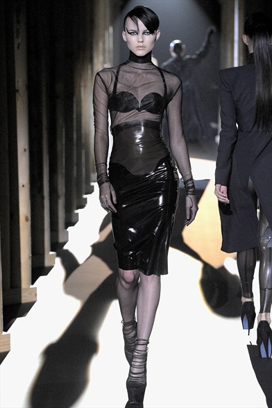 Provocanti vedove nere dalla passerella Mugler : silhouette affilata , abito seconda pelle con inserti in tulle , bluse see- trough su gonna costrittiva in latex e collant velatissimi . Glamour sexy e ( molto ) perverso , anche per i booties con platform e tacco a uncino