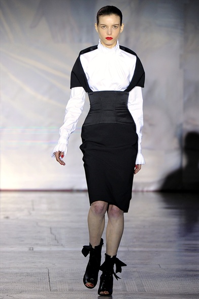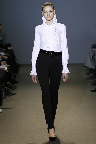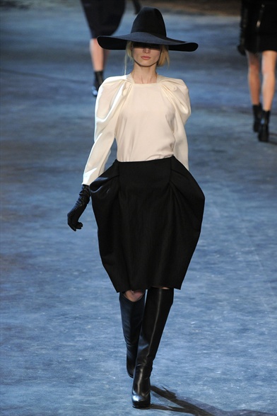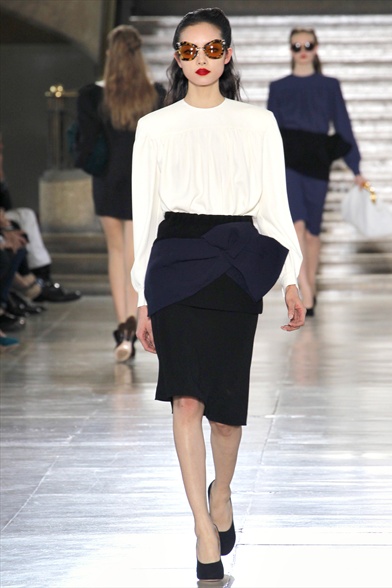 Oppure si avvale del tocco haute – couture- grazie a jabot intorno al collo e lavorazioni a raggio dando vita ad un binomio classico con pant – Andrew Gn- e gonna . Funny per la camicia ballon su gonna con fiocco – Miu Miu- ; chic per la blusa arricciata su gonna a palloncino- Lanvin –
