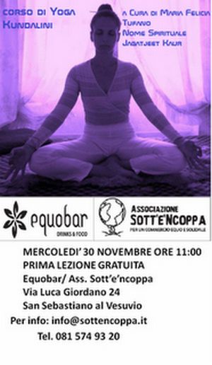 Le lezioni verteranno sui canoni d’insegnamento del Maestro Yogi Bhajan Equobar e dai principi dell’associazione “Sott’e’Ncoppa”. Il corso di “yoga Kundalini” proseguirà nel mese di Dicembre il mercoledì Mattina dalle 11:00 alle 12:20.