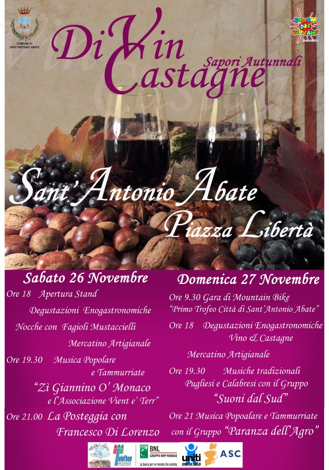 Appuntamento con i sapori autunnali a Sant’Antonio Abate. Per sabato 26 novembre e domenica 27, presso la centrale Piazza della Libertà, il Forum dei giovani abatese, in collaborazione con il Comune di Sant’Antonio Abate, promuoverà la prima edizione di “DiVin Castagne”.