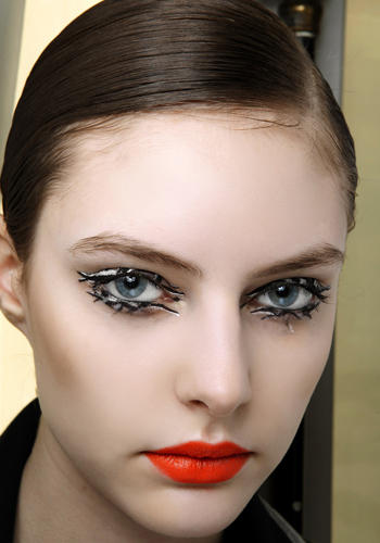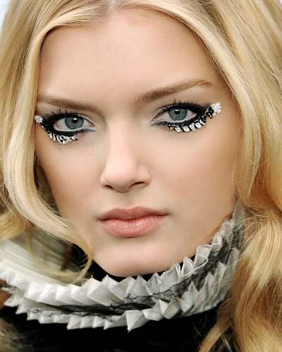 dell’autunno/inverno 09-10 Chanel . Accento ( marcato ) posto solo ed esclusivamente su quella inferiore , sottolineato dall’aggiunta di tanti piccoli cristalli , uniti con un filo di seta nera ; il tutto fissato con una goccia di colla per ciglia finte . Tanto mascara nero , eyeliner e matita per enfatizzare drammaticamente il contorno velato da una spolverata di ombretto grigio . Matita bianca all’interno per aprire lo sguardo .