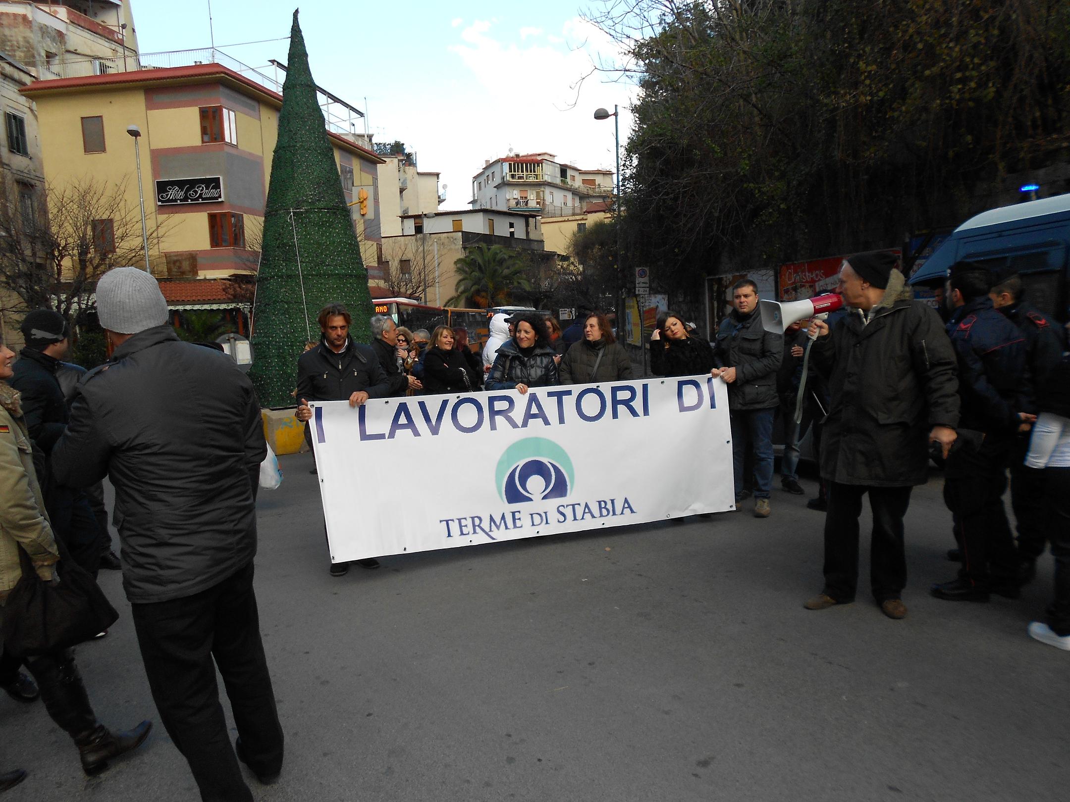 Circa 50 lavoratori delle Terme di Stabia sono scesi in piazza per manifestare tutto il loro malcontento che deriva dalla grave situazione degli stipendi arretrati e dalla mancata presentazione del piano industriale, promesso dal direttore generale Trevisan al suo insediamento ma di cui oggi non vi è traccia. Nonostante sia arrivato un acconto dello stipendio (700 euro) hanno deciso di protestare perché preoccupati per il futuro dello stabilimento termale, che al momento presenta un buco in bilancio di quasi quattro milioni di euro. Dall’inizio del mese di dicembre i termali sono in cassa integrazione ed in attesa degli stipendi arretrati. La protesta è partita alle 10 e 30 quando i termali si sono riuniti all’ingresso del complesso del Solaro per poi scendere all’incrocio tra viale delle Terme e viale delle Puglie. Qui hanno bloccato il traffico veicolare per circa mezz’ora, poi il blocco si è trasferito all’inizio di viale delle Puglie (presso la rotonda). Alla protesta hanno aderito i lavoratori delle sigle sindacali di Cgil, Cisl e Ugl mentre Usae e Uil si sono dissociate. “Anche se abbiamo ricevuto un acconto dello stipendio poco prima di Natale tutto ciò non ci soddisfa – ha dichiarato Filippo Criscuolo, dirigente regionale di Cgil- Filcams – Siamo preoccupati per la mancanza del piano industriale di rilancio e di rientro degli stipendi arretrati. Non ci sono prospettive per la salvaguardia occupazionale. In questo anno e mezzo non si è mosso niente, a partire dalla gestione Iovieno e poi i vari Dello Ioio e Ventriglia. Non sono queste le premesse per il prolungamento della cassa integrazione. La ricapitalizzazione ci metterà al riparo dal fallimento ma sono capitali virtuali. Trascorreremo un Natale difficile, tutti i politici si passino una mano per la coscienza. Noi siamo facinorosi ma solo lavoratori preoccupati per il futuro dell’azienda”. “fa piacere che oggi sia arrivato l’acconto dello stipendio ma quello che ci interessa è il rilancio aziendale ed il rispetto dei periodi occupazionali – ha detto salvatore Suarato, rappresentante sindacale della Fisascat-Cisl – La ricapitalizzazione è slittata più volte e tarda ad arrivare. Quello che più ci rammarica è essere etichettati come zavorra dell’azienda (riferendosi ai lavoratori stagionali) e come facinorosi. Siamo lavoratori che non percepiscono lo stipendio, chiediamo garanzie. Non siamo strumentalizzati dalla politica, anzi faccio un appello affinché maggioranza ed opposizione si uniscano per risolvere il problema”.