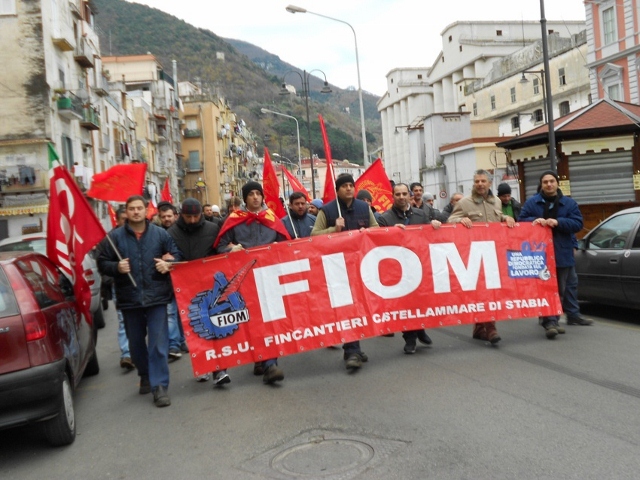 Questa mattina, come annunciato, gli operai dello stabilimento Fincantieri che fanno riferimento alla sigla sindacale della Fiom-Cgil hanno sfilato in corteo per le strade di Castellammare. Il corteo di circa 50 tute blu è partito dall’ingresso del cantiere di via Duilio alle ore 9 per poi arrivare alle porte di Palazzo Farnese. Anche gli operai stabiesi hanno recepito la linea del sindacato Fiom a livello nazionale, lo scorso 21 dicembre la loro firma non fu apposta all’accordo (sottoscritto invece da Fim, Uilm, Failms e Ugl) preso al ministero del Lavoro con l’azienda che ha decretato la cassa integrazione straordinaria per i prossimi 24 mesi. Scioperano perché secondo loro nell’accordo firmato lo scorso dicembre dalle altre sigle sindacali compaiono parole come riconversione e razionalizzazione delle aree, novazione del lavoro. Parole che non piacciono alla Fiom, parole che sarebbero il preludio alla divisione del cantiere. “Siamo scesi in piazza per dire no all’accordo dello scorso 21 dicembre – ha detto il coordinatore della Fiom-Cgil Francesco D’Auria – Quell’accordo porterà alla chiusura del cantiere entro 4 anni. Si parla di razionalizzazione e riconversione delle aree. Per quanto riguarda il rapporto degli operai si prevede la novazione del lavoro e a tutto questo la Fiom dice no. Chiediamo lavoro e non solo la cassa integrazione”. Il prossimo 16 gennaio si terrà una riunione del coordinamento nazionale della Fiom in cui si decideranno altre mobilitazioni. Spaccatura tra le sigle sindacali che difficilmente rientrerà, infatti anche dopo l’incontro con il ministro dello Sviluppo economico, Corrado Passera, la Fiom è rimasta scettica nonostante l’impegno del Governo a supportare il settore della cantieristica nazionale. Ministro Passera che ancora non ha risposto alla chiamata di Bobbio, Cesaro e Caldoro per l’accelerazione dell’iter che, dopo la firma del protocollo d’intesa, dovrebbe portare alla sottoscrizione dell’accordo di programma