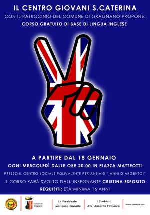 A partire da mercoledì 18 gennaio (ogni mercoledì) alle ore 20 presso la sede del centro sociale polivalente per anziani “anni d’argento” di piazza Matteotti si terrà IL CORSO GRATUITO DI BASE DI LINGUA INGLESE tenuto dalla docente Cristina Esposito.Il corso è stato promosso dal centro giovani S. Caterina e patrocinato dal Comune di Gragnano. Verrà rilasciato un attestato di partecipazione al termine del corso.