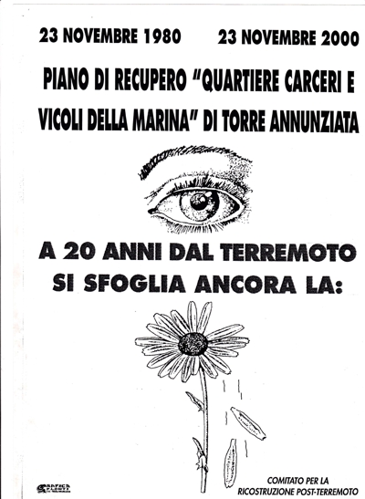 Comitato per la ricostruzione post terremoto ( per la sua costituzione vedi manifesto alla città del 1997) a dare seguito al piano di recupero, ad ogni incontro invece di cercare una qualunque soluzione, frapponeva palesemente sempre nuovi ostacoli alla ricostruzione. A nulla valsero neanche i numerosi esposti al Sig. Prefetto ed altri organi istituzionali, come a niente valsero le argomentazioni portate dal Comitato circa il beneficio che ne avrebbe ricavato la città in termini occupazionali e di salvaguardia territoriale. Nè tantomeno i manifesti murali che ad ogni ricorrenza del 23 novembre il Comitato faceva affiggere in città per ravvivare la richiesta della ricostruzione fecero mutare l’ atteggiamento inerte dell’ intero esecutivo cittadino.