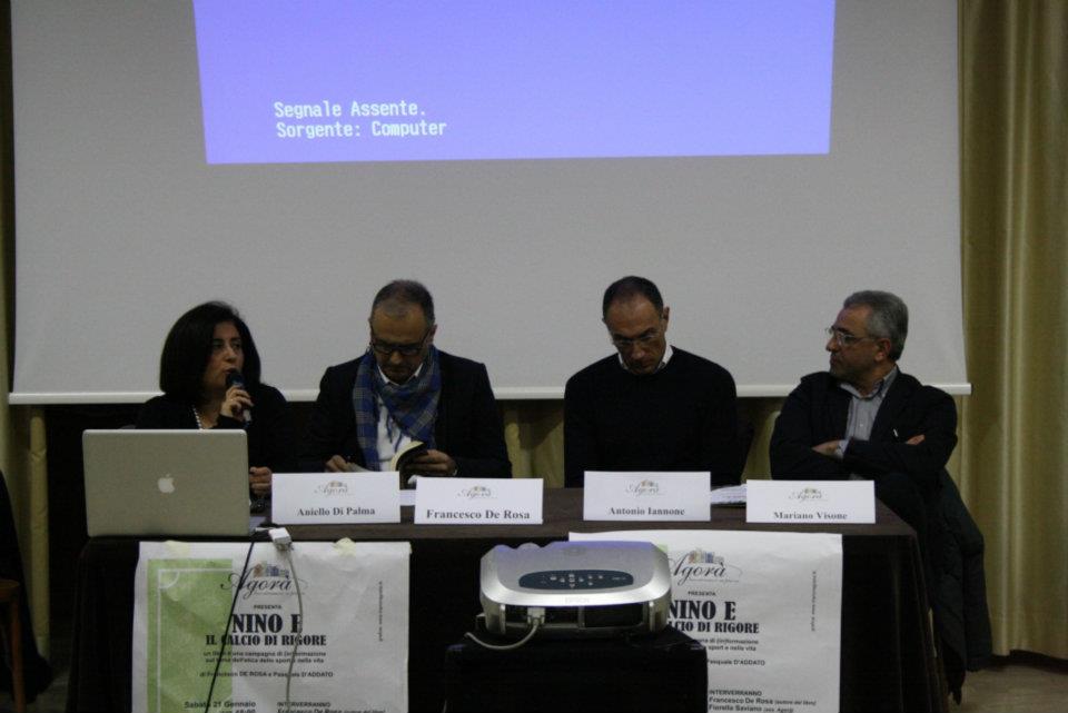 Ma la passione per lo sport e per ciò che genuinamente rappresenta si risveglia non appena arrivano determinati risultati o si affermano positive performance sportive. Così si fa strada l’etica sportiva che trova il suo humus in comportamenti buoni ed autentici. L’etica va scoperta “nello” sport ed è testimoniata dalle performances di uomini e donne sportivi “riusciti” nella vita. Nella competizione sportiva, mettere in gioco le proprie abilità deve rappresentare una sfida interiore, uno specchio in cui riflettere il proprio percorso di vita. E’ questo il messaggio di “Nino e il calcio di rigore”, scritto dal manager e dirigente arbitrale biscegliese Pasquale D’Addato assieme al giornalista-scrittore napoletano Francesco De Rosa per la Neomediaitalia. Un libro il cui dichiarato intento è di fornire efficaci argomentazioni affinché l’Unesco possa dichiarare la figura dell’arbitro, di ogni disciplina e in qualsiasi ambito, “testimone di pace” . Il libro è stato presentato qualche giorno fa ad Ottaviano dall’associazione Agorà nella sala parrocchiale della Chiesa di S. Francesco di Paola. La serata, piacevole per i contenuti trattati ,è stata moderata dalla dott.ssa Fiorella Saviano, presidente dell’associazione, e si è avvalsa del contributo dell’autore, Francesco de Rosa che ha parlato della genesi e delle motivazioni sottese alla trama del racconto, della testimonianza di un ex arbitro, Antonio Iannone, e dell’esperienza in campo sportivo dell’avv. Mariano Visone. Erano presenti per l’Ente locale, l’assessore Aniello Di Palma e vari rappresentanti di istituzioni sportive ed associazioni del territorio.