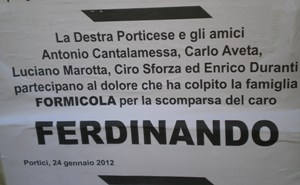 A seguito della scomparsa di Ferdinando Formicola, avvenuta lo scorso martedì, sono stati numerosi i messaggi di cordoglio lasciati da amici e parenti. Tra i tanti messaggi di vicinanza alla famiglia apparsi sul territorio, però, uno su tutti ha lasciato sbigottiti ed esterrefatti alcuni consiglieri comunali. Sulle mura della città, infatti, è stato affisso un manifesto del partito “La Destra” dove veniva diffuso un messaggio di condoglianze alla famiglia Formicola. Un tradizionale rituale in queste tristi circostanze. Ma a lasciare perplessi sono state le firme che seguivano il messaggio. Oltre agli storici personaggi legati da sempre al partito di Francesco Storace come Antonio Cantalamessa, Luciano Marotta e Carlo Aveta, attuale consigliere comunale e regionale, erano presenti anche le firme di Ciro Sforza ed Enrico Duranti, consiglieri comunali in forza al Popolo della Libertà. Un particolare che non è sfuggito agli occhi più attenti, che hanno notato l’accostamento dei due consiglieri comunali del Pdl con La Destra.