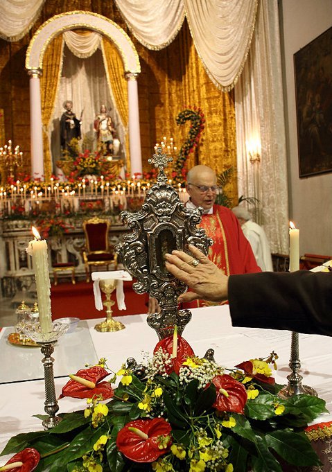 Le reliquie autentiche dei due Santi sono ora collocate parte in un cassettinocon vetro sotto la statua d’argento di San Ciro, una pregevole opera di autoreignoto del XVII secolo, parte in un reliquario d’argento: entrambe sonomostrate alla venerazione dei fedeli il 31 gennaio di ogni anno e portate inprocessione per le principali vie della Città, che da oltre quattro secoli levenera.