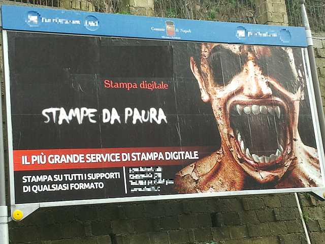 “Chiediamo al Comune di Napoli – dichiarano il commissario regionale dei Verdi Francesco Emilio Borrelli ed il segretario regionale del sindacato UilTucs Rino Strazzullo – di rimuovere urgentemente una orribile pubblicità affissa su tabelloni dell’amministrazione che terrorrizza i bambini e le persone particolarmente sensibili in cui appare una figura mostruosa per pubblicizzare una società di stampe digitali. Tra l’altro molti di questi orrendi manifesti sono stati posizionati proprio all’ uscita di istituti elementari. Tanti genitori ci hanno contattato perchè i propri bambini sono terrorizzati quando vanno a scuola, addittura alcuni piangono e ne chiedono l’ immediata rimozione. Chi ha autorizzato una simile pubblicità ha commesso un grosso errore a cui deve porre urgentemente rimedio. Non vogliamo la censura ma certe immagini così orrende non possono essere affisse per le strade cittadine”.