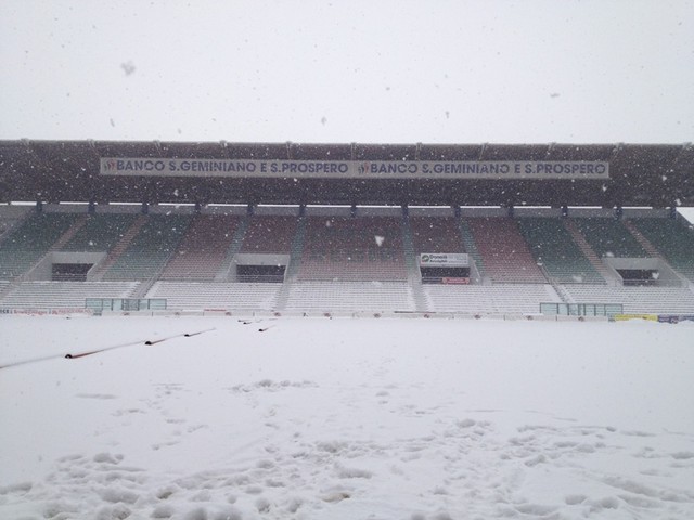 Alla fine ha prevalso il buonsenso. Su Reggio Emilia nevica da ieri sera e in città sono caduti già oltre 50 centimetri di neve, ma le previsioni meteo dicono che il peggio deve ancora venire. In queste condizioni sarebbe stato impossibile giocare anche in presenza dei teloni stesi per proteggere l’erba del Giglio.