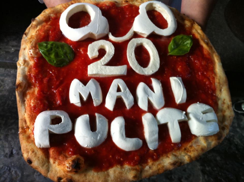 “Abbiamo realizzato la pizza “Mani Pulite” – dichiarano il commissario regionale dei Verdi Francesco Emilio Borrelli ed il pizzaiolo Gino Sorbillo – in occasione del ventennale dallo scoppio di “tangentopoli” che colpì pesantemente anche Napoli e la sua classe dirigente. La pizza è formata da due manette realizzate con la mozzarella e la scritta “20 anni di mani pulite”. Mentre la esponevamo alcuni cittadini ci hanno fermato per strada mostrandoci le famose monetine che furono lanciate dalla folla infuriata contro l’ allora leader del Psi Bettino Craxi. Sta montando un nuovo moto di indignazione popolare contro la curruzione e le ruberie dei politici soprattutto quelli locali”.