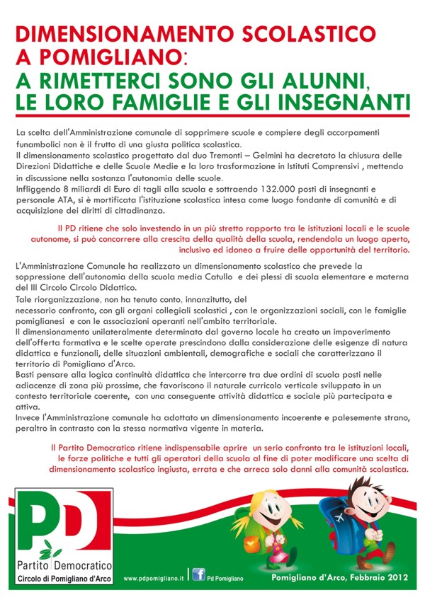 Il Partito Democratico di Pomigliano D’Arco esprime forte disagio e grave preoccupazione in merito alla scelta dell’Amministrazione Comunale di sopprimere scuole e compiere degli accorpamenti “funambolici”. “Il dimensionamento scolastico progettato dal duo Tremonti – Gelmini – si legge nel documento dei democratici – ha decretato la chiusura delle Direzioni Didattiche e delle Scuole Medie e la loro trasformazione in Istituti Comprensivi, mettendo in discussione nella sostanza l’autonomia delle scuole. Infliggendo 8 miliardi di euro di tagli alla scuola e sottraendo 132.000 posti di insegnanti e personale ATA, si è così mortificata l’istruzione intesa come luogo fondante di comunità e di acquisizione dei diritti di cittadinanza. A sua volta l’Amministrazione Comunale di centro destra ha realizzato un dimensionamento scolastico che prevede la soppressione dell’autonomia della scuola media Catullo e dei plessi della scuola elementare e materna del III Circolo Didattico. Tale organizzazione – argomentano dal Pd – non ha tenuto conto, innanzitutto del necessario confronto , con gli organi collegiali scolastici, con le organizzazioni sociali, con le famiglie pomiglianesi e con le associazioni operanti nell’ambito territoriale. il dimensionamento unilateralmente determinato dal governo locale ha creato un impoverimento dell’offerta formativa e le scelte operate prescindono dalla considerazione delle esigenze di natura didattica e funzionali, dalle situazioni ambientali, demografiche e sociali che caratterizzano il territorio di Pomigliano D’Arco. Basti pensare alla logica continuità didattica che intercorre tra due ordini di scuola posti nelle adiacenze di zone più prossime, che favoriscono il naturale curricolo verticale sviluppato in un contesto territoriale coerente, con una conseguente attività didattica e sociale più partecipata e attiva. Invece – proseguono dal Pd – l’Amministrazione comunale ha adottato un dimensionamento incoerente e palesemente strano, peraltro in contrasto con la normativa vigente in materia. Il Partito Democratico ritiene indispensabile aprire un serio confronto tra le istituzioni locali , le forze politiche e tutti gli operatori della scuola al fine di poter modificare una scelta di dimensionamento ingiusta errata e che arreca solo danni alla comunità scolastica. A rimetterci saranno solo gli alunni e le loro famiglie”. Un tema caro ai democratici quello dell’istruzione. Soltanto qualche mese fa il Pd con il suo gruppo consiliare erano intervenuti sul problema della carenza degli istituti scolastici in città chiedendo un intervento diretto della Provincia. In quell’occasione i riflettori furono puntati sulla mancanza di aule per gli istituti superiori.