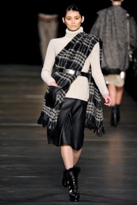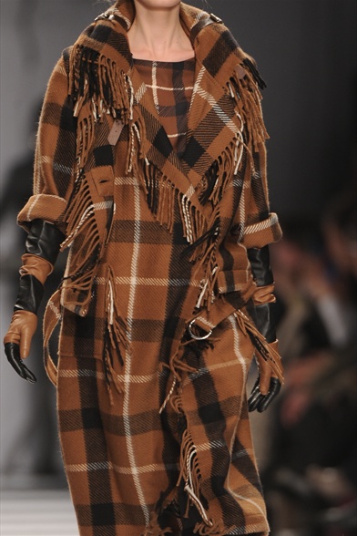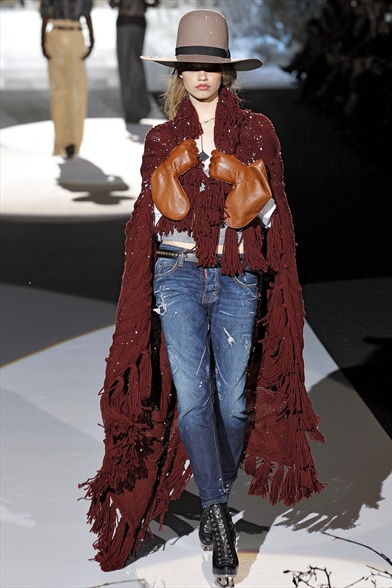 Allure decisamente country sulla passerella Dsquared2 : la coperta in tartan viene drappeggiata , intrecciata , annodata come fosse un pareo e si sovrappone a jeans used . Diventando l’accento perfetto di un look da vera pioniera ottocentesca con