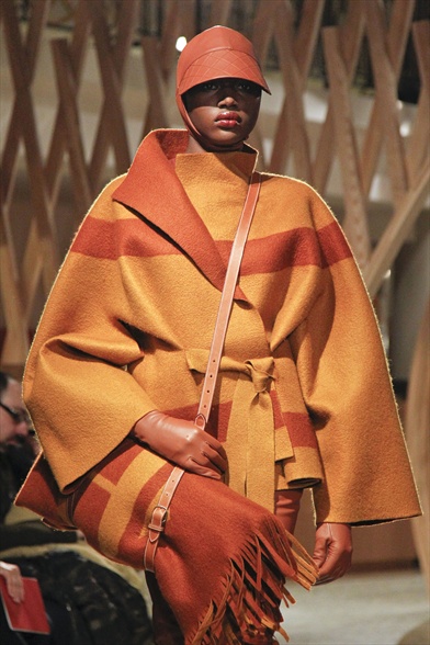Strizza l’occhio ad un certo nomadismo di lusso la coperta firmata Hermès trasformata all’occorenza in un avvolgente caban dai colori caldi delle spezie.