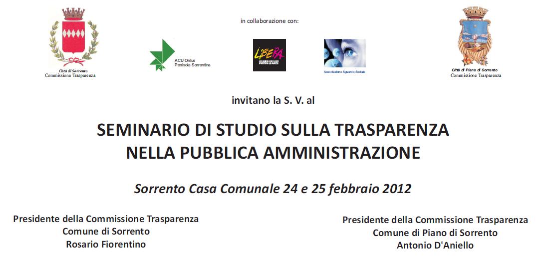 Oggi (venerdì 24) pomeriggio e domani (sabato 25) mattina, presso la Casa Comunale di Sorrento, si svolgerà il Seminario di Studio sulla Trasparenza nella Pubblica Amministrazione. L’evento, organizzato in collaborazione con le Commissioni Trasparenza di Sorrento e Piano di Sorrento, ACU Onlus Penisola Sorrentina, Libera e Associazione Sguardo Sociale, sarà coordinato dall’avvocato Luigi Alfano e dal cancelliere Carlo Lubrano, e vedrà la presenza di Rosario Fiorentino e Antonio D’Aniello, presidenti delle commissioni Trasparenza dei Comuni di Sorrento e Piano di Sorrento.