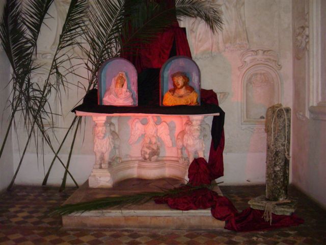 La mostra. Nella Cappella detta dei Morti sono esposte due sculture in ceroplastica del XVIII secolo, mentre nella Sala della Foresteria ad accogliere i visitatori Parati Liturgici del XVII secolo. Una dolorosa Madonna a mezzo busto realizzata in cera dipinta, con la testa reclinata all’indietro, gli occhi e le labbra socchiusi, fa pendant con la figura del Cristo, suo figlio, scolpito nell’accezione iconografica  dell’Ecce Homo: la corona di spine posata sul capo, il petto trafitto punteggiato da  numerose gocce di sangue, le spalle coperte dal drappeggio di una veste di seta sbiadita color ambra che, tuttavia, tra le pieghe nasconde l’originale colore rosso. L’intera composizione trova i suoi riferimenti stilistici nella produzione napoletana in ceroplastica dell’età  barocca, tecnica che ben si prestava alla drammatizzazione della morte nei suoi più ampi significati, tanto che spesso veniva utilizzata anche per scopi didattici mediante le fedeli riproduzioni anatomiche dei corpi.  I busti provengono da una cappella secondaria della Chiesa della Certosa, sottoposti a restauro conservativo negli anni addietro, hanno trovato adeguata collocazione tra le opere d’arte integrative (fuori catalogo) della Mostra La Certosa Ritrovata, ma possono dirsi sostanzialmemente inedite. Ad accogliere il visitatore nella sala dell’anti-biglietteria, ancora un’installazione dedicata al tema della Pasqua:  due eleganti strisce in velluto con ricami in seta e oro del XVII secolo, esemplari superstiti della preziosa collezione di  Parati Liturgici dei Padri Certosini.  L’installazione si arricchisce di una pianta di ulivo (fornita dalla Ditta Eurogiardinaggio Nicola Maisto, ndr), scelta sia per il ruolo fondamentale che l’ulivo riveste nel periodo pasquale, oltre ad essere da sempre considerato simbolo di pace.