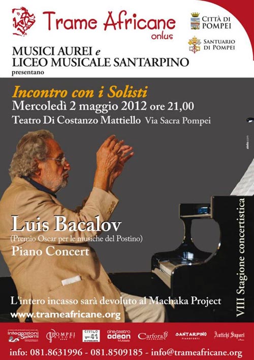 Mercoledì 2 maggio alle ore 21,00, Teatro Di Costanzo Mattiello a Pompei, Gran Galà di chiusura della VIII Stagione Concertistica “INCONTRO CON I SOLISTI”. con il Maestro Luis Bacalov, premio oscar per le musiche del “Postino”. Tanghi e musiche da film per un “Piano Solo Concert”.