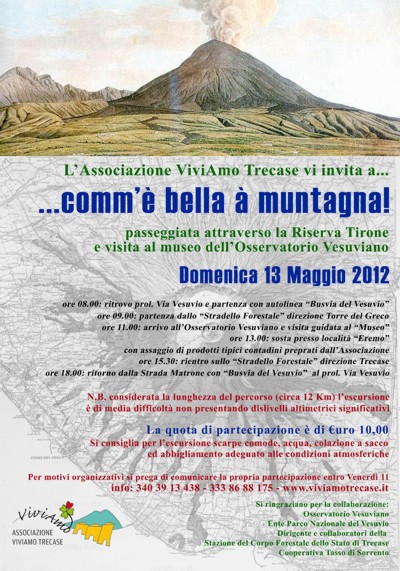 L’associazione “ViviAmo Trecase” ha organizzato per domenica 13 maggio la manifestazione “Comm’e’ bella a muntagna!”.L’iniziativa, attraverso un percorso naturalistico, storico e scientifico vuole sensibilizzare i cittadini, trecasesi e non, sulla importanza che il Parco Nazionale del Vesuvio può avere come risorsa trainante per lo sviluppo turistico ed economico del territorio.