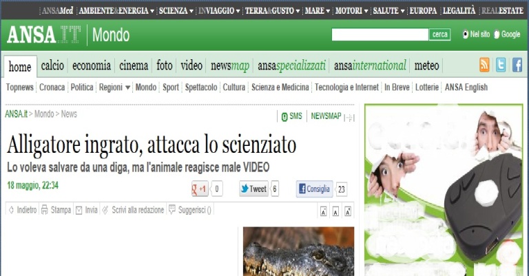 La notizia ha dell’incredibile ed infatti è falsa, il titolo di questo articolo è uno sfottò ad un titolo “serio”: ALLIGATORE INGRATO, ATTACCA LO SCIENZIATO, apparso il 18 maggio 2012 nella homepage del sito web dell’ANSA, la principale agenzia di stampa italiana. Sembra, stando a quello che si apprende, che questo alligatore privo di riconoscenza prima si sia fatto salvare dal prode scienziato e dopo gli abbia rifilato un bel morso. Proprio una bestia questo animale ingrato!