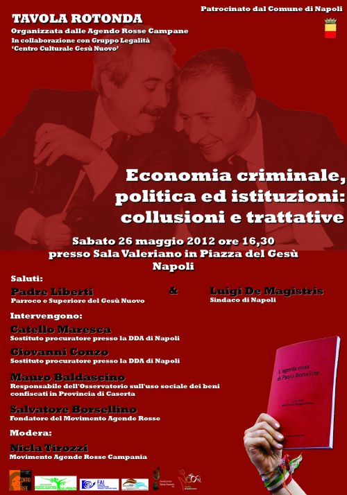 Organizzata dal Movimento Agende Rosse – Campania in collaborazione col Gruppo Legalità del Centro Culturale “Gesù Nuovo” e patrocinata dal Comune di Napoli. Intervengono: Salvatore Borsellino, fondatore del Movimento Agende Rosse; Giovanni Conzo, sost. Proc. Presso la DDA di Napoli; Catello Maresca, sost. Proc. Presso la DDA di Napoli; Luigi De Magistris, Sindaco di Napoli; Mauro Baldascino, Economista dell’Osservatorio provinciale uso sociale beni confiscati in prov. di Caserta.