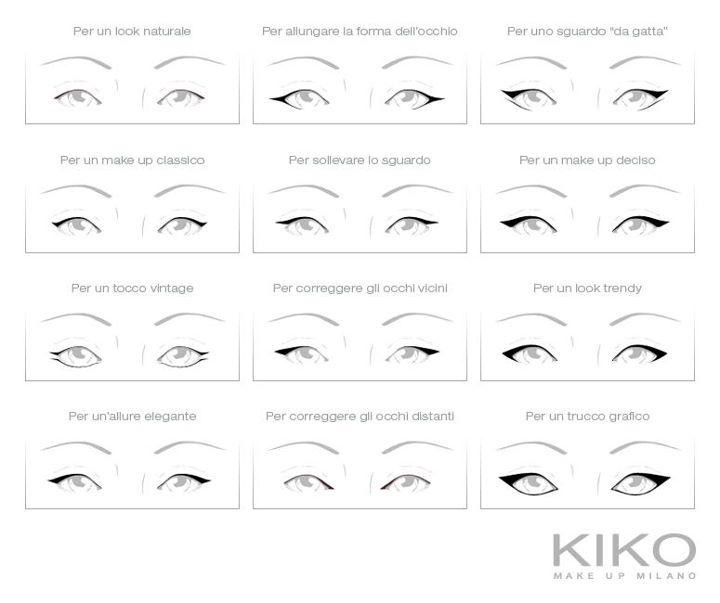 Quando si parla di eyeliner l’accento si posa sui tanti e svariati tipi . Tipologie diverse che danno vita a svariati effetti , ma utili , anche , per correggere i difetti dell’occhio , come ci mostra Kiko Milano in una tabella pubblicata sul sito .