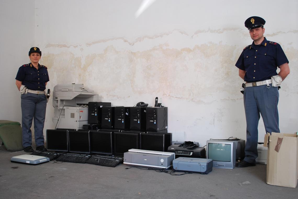 Arrivati nei pressi del deposito, l’uomo ha tentato una disperata e maldestra fuga attraverso i vicoletti adiacenti il deposito. Dopo pochi metri è stato però raggiunto e bloccato dai poliziotti. Entrati finalmente nel deposito, i poliziotti hanno rinvenuto un vistoso quantitativo di materiale informatico-elettronico. Accantonati su un lato del locale, c’erano infatti 10 PC, 10 monitors, 9 tastiere, diverse stampanti, telefoni cordless, 2 televisori, un lettore DvD, uno scanner, un gruppo di continuità e 2 scatole di cartone contenenti software, cavi e connettori per PC. Gran parte del materiale trovato nel deposito riportava tra l’altro dei riferimenti all’Istituto Pertini di San Sebastiano al Vesuvio, luogo dove i poliziotti sapevano che nei giorni scorsi era stato compiuto un clamoroso furto di materiale informatico. Gaetano Vulcano è stato quindi condotto presso gli uffici del Commissariato dove ha tentato nuovamente la fuga ma ancora invano.